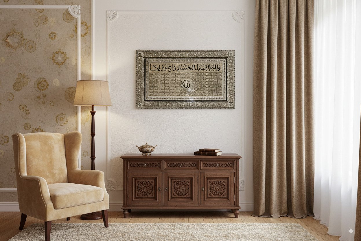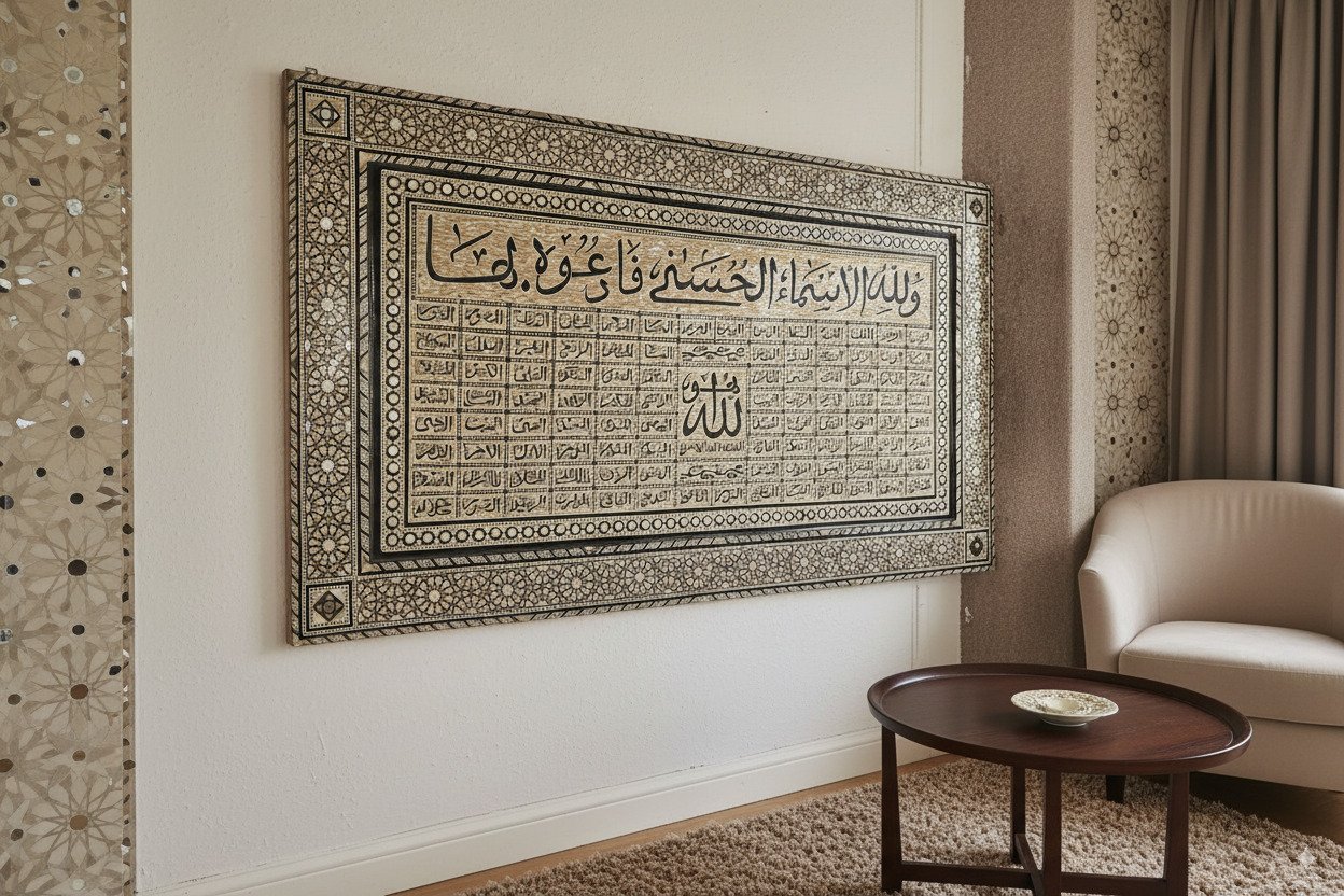 Stunning handmade Islamic wall art featuring the 99 Names of Allah (Asma Allah al Husna), masterfully inlaid in mother-of-pearl and set in a traditional mosaic frame. This intricate piece showcases sacred Arabic calligraphy woven into geometric artistry — a spiritual and decorative treasure for any home or place of worship.