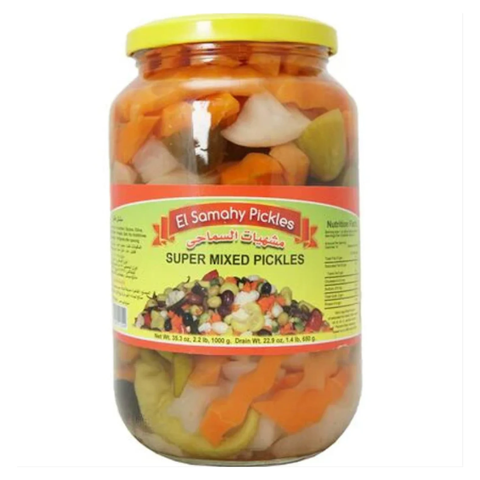 Authentic Egyptian mixed pickles from El Samahi. Available in regular or spicy. Perfect accompaniment for traditional meals. Weight: 1kg